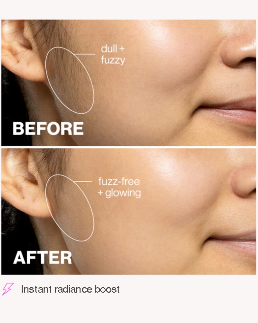 Thanks to Enhanced Sonic Speed Technology, LUXE+ glides effortlessly across your skin, instantly removing dead skin cells and fine facial hair. Your skincare products are absorbed much more effectively, and your makeup applies silky-smooth and flawlessly! No need to worry about small cuts or irritation — the new Microfine™ Blades provide maximum comfort and precision, while the Exclusive Safety Technology ensures